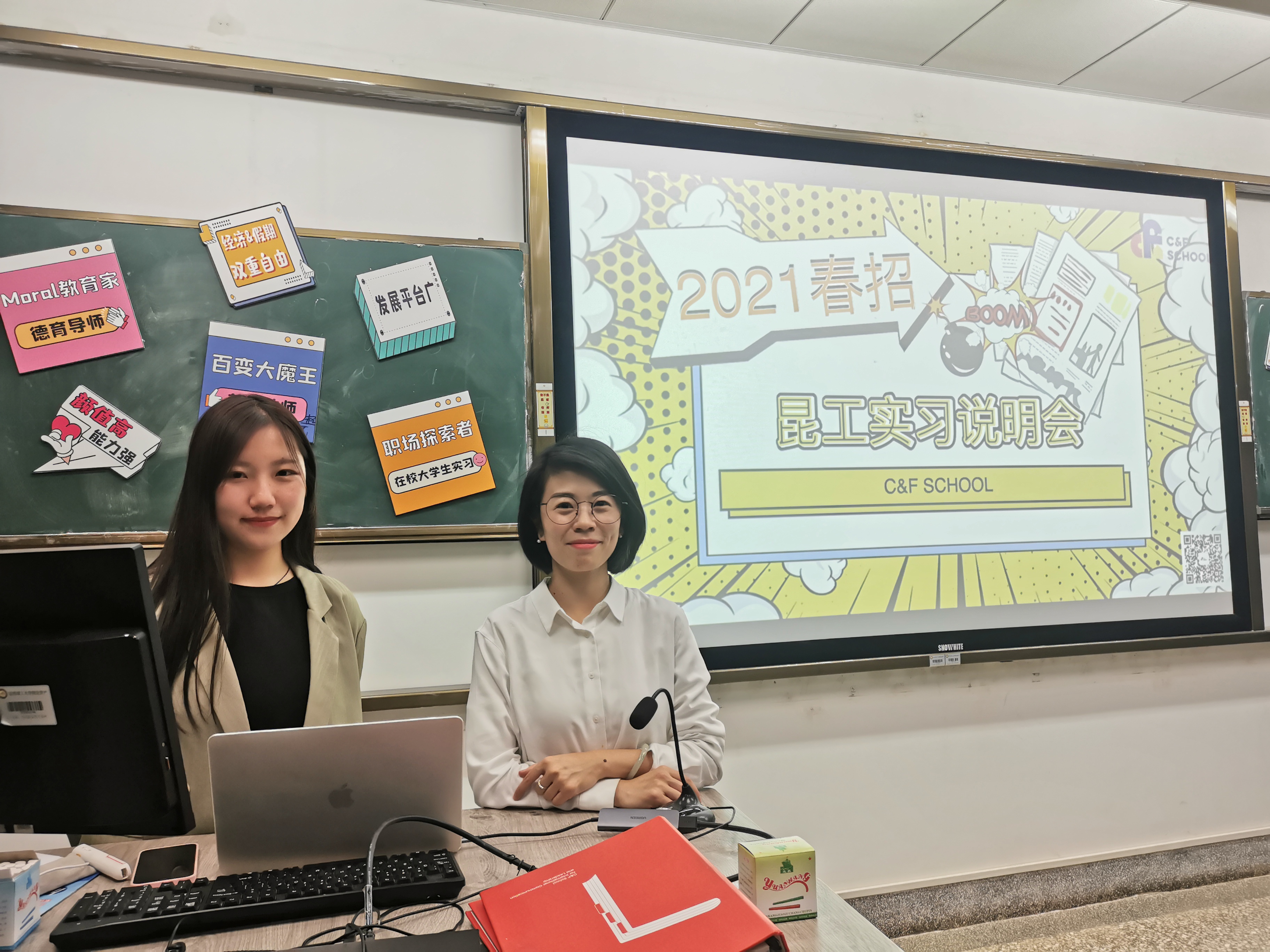 在多媒体408教室举办C&F公社(C&F School for International Communication and Leadership 阳光心霖儿童公社)实习说明会,本次活动由C&F公社人力资源总监Livia和校招经理Vicky主讲,外文院2018级共35人参加。