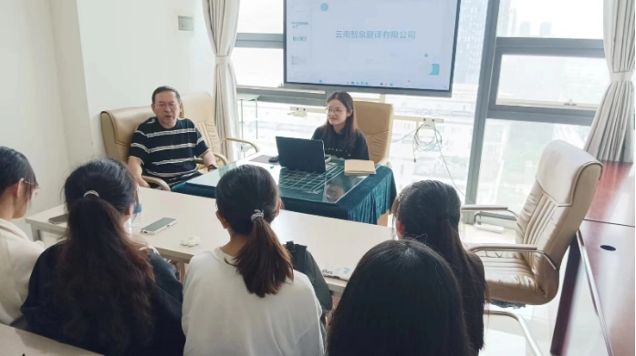 一行受到云南智泉翻译公司总经理解蒙热情接待。解蒙经理与到访师生展开座谈,对公司的发展历程、公司架构、人才需求进行了介绍,并针对翻译行业的机遇与挑战、翻译人才的技术素养等作了详细介绍。公司项目经理郑丽丹老师介绍了翻译项目管理的基本流程,并通过现场实操让学生们直观地了解了翻译软件的使用以及专业翻译中团队协作的效率与重要性。