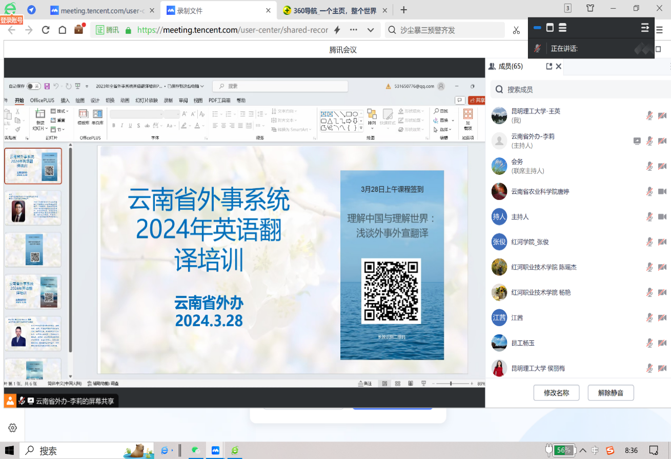 3月28日,云南省外办举办2024年全省外事系统英语翻译培训(线上+线下)。培训特邀中国外文局教育培训中心全国高端应用型翻译人才培养基地特聘教师、一级翻译王冰和上海外国语大学高级翻译大象视频