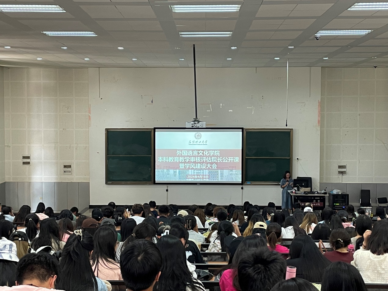 于博文100报告厅举行了本科教育教学审核评估院长公开课暨学风建设大会。院长王英,院党委副书记邱清遐,英语系全体教师,院学工办负责人、全体本科生辅导员和班主任,以及全体本科学生参加会议。会议由副院长马倩主持。