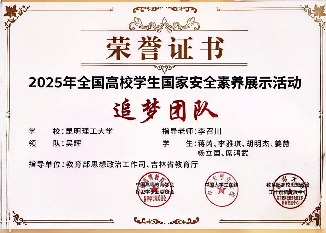 代表队一路“过关斩将”,取得全国第十名的佳绩,并斩获国家安全素养展示活动“追梦团队”荣誉称号。