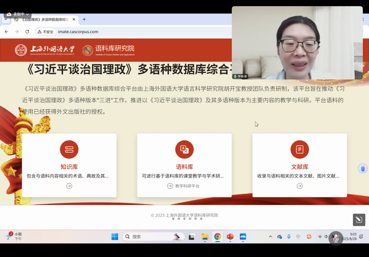 讲座系统介绍了上海外国语大学语料库研究院研发的《习近平谈治国理政》多语种数据库综合平台的核心功能与实际应用价值。该平台集语料库、术语库、文献库三大模块于一体,依托数据化与可视化技术,实现对高频词和搭配模式的智能分析,并提供精准的语料检索与应用服务。李晓倩博士现场演示了平台操作流程,并结合多个高校师生运用该平台开展时政文本分析及科学研究的实际案例,生动展现了其在教学与科研中的广泛前景。