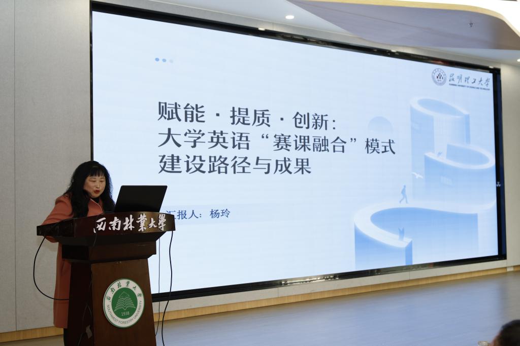 分享环节,杨玲以《赋能提质创新:大学英语“赛课融合”模式建设路径与成果》为题作主题发言。详细介绍了我校近年来精心构建的“一核为轴、三线牵引、五融联动”大学英语育人体系,深入阐释了以老带新、以优促强的“传帮带”教学团队建设机制,并系统复盘了我校践行“以赛促教、以赛促改、以赛促学”理念的大学英语教学改革实践与显著成效。此次分享得到了与会兄弟院校代表的高度认可,表示我校“赛课融合”模式及育人体系建设经验极具借鉴价值。