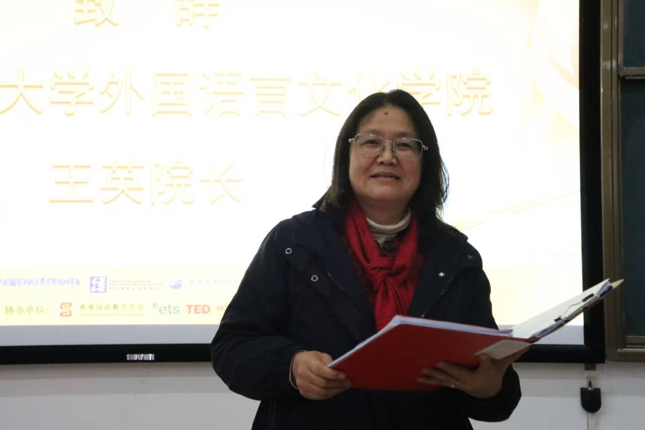 院长王英进行总结发言。她表示,“用英语讲中国故事大会”不仅是一场赛事,更是青年学子肩负文化传播使命的实践契机,希望同学们积极参与,在准备过程中深入挖掘中华文化精髓,用生动的英语表达让世界更好地认识中国。