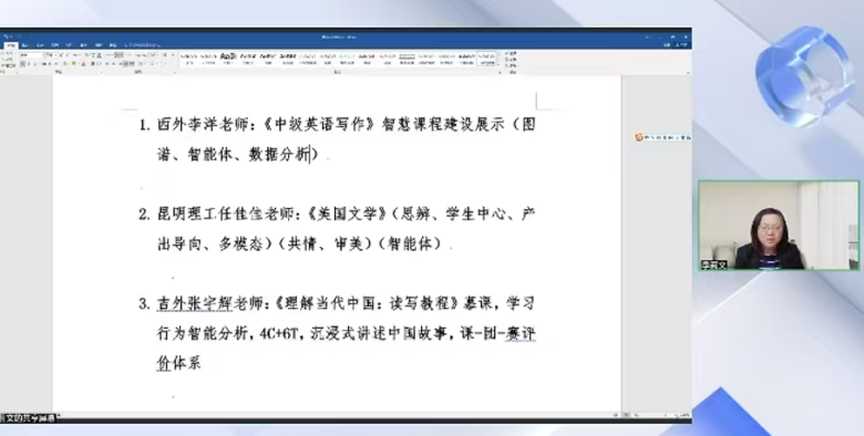 来自西安外国语大学、吉林外国语大学其他两位老师分别围绕《中级英语写作》《理解当代中国英语读写》,分享了智慧教学方案与教学设计。