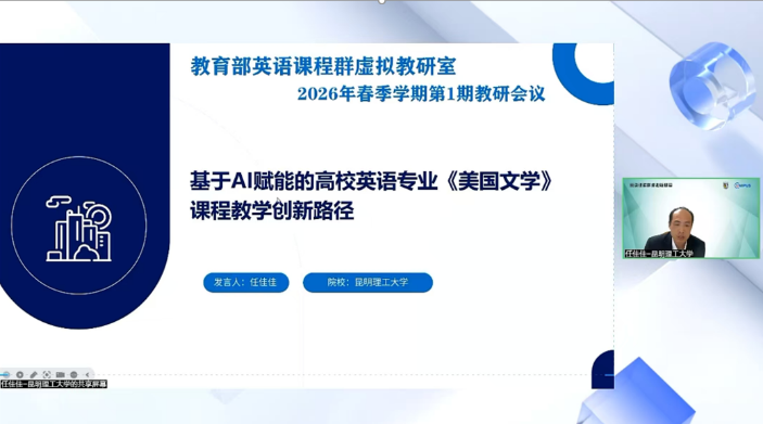 教师任佳佳博士参加了由北京外国语大学与外研在线联合举办的“教育部英语课程群虚拟教研室”2026年春季学期第1期教学研讨会。本期教研活动以“英语智慧课程设计与使用”为主题。