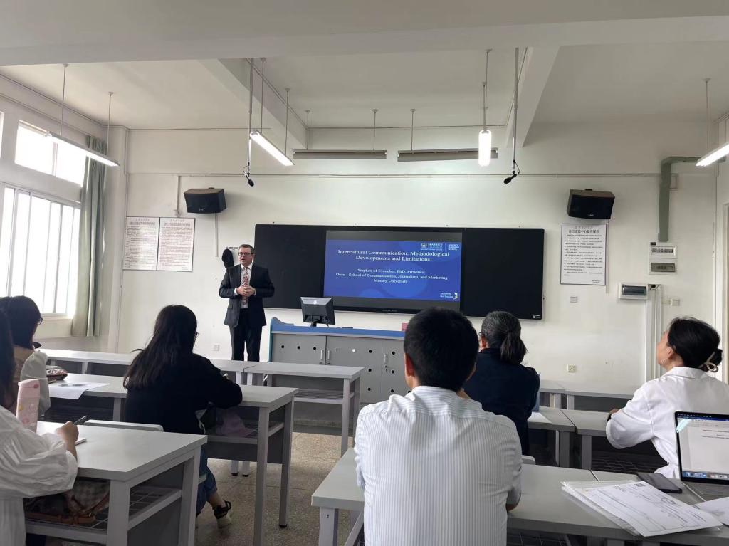 承办的两场明德社科大讲坛在博文楼举行。论坛邀请新西兰梅西大学Prof. Stephen Croucher和Dr. Li Mingsheng到校作了学术讲座,分别由郑景婷教授和郭怡军教授主持,全院近百名教师和MTI研究生参加了讲座。