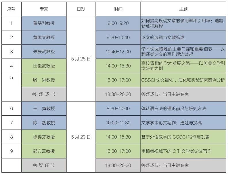 研修班上,王寅教授就体认语言学的理论前沿和研究方法做了阐释;徐锦芬教授介绍了外语教学的CSSCI写作与发表;蔡基刚教授从选题方面阐述如何提高投稿文章的录用率和引用率;黄国文教授着重论述了论文的选题和文献综述的撰写;滕琳教授就CSSCI论文量化、质性和实验研究案例进行了分析;朱振武教授从翻译类论文总结论文取胜的主要门径和细节;田俊武教授以英美文学为例谈到了高校教师的学术发展之路;陈靓教授对文学学术论文写作的选题与投稿做了阐释;郭方云教授从审稿者的视域谈了C刊文学类论文写作。会后大象视频