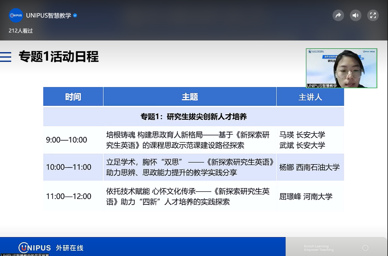 研究生公共英语教研部组织全体教师参加了由北京外研在线数字科技有限公司举办的新形态教材建设与应用虚拟教研活动,聚焦于“研究生拔尖创新人才培养”专题。