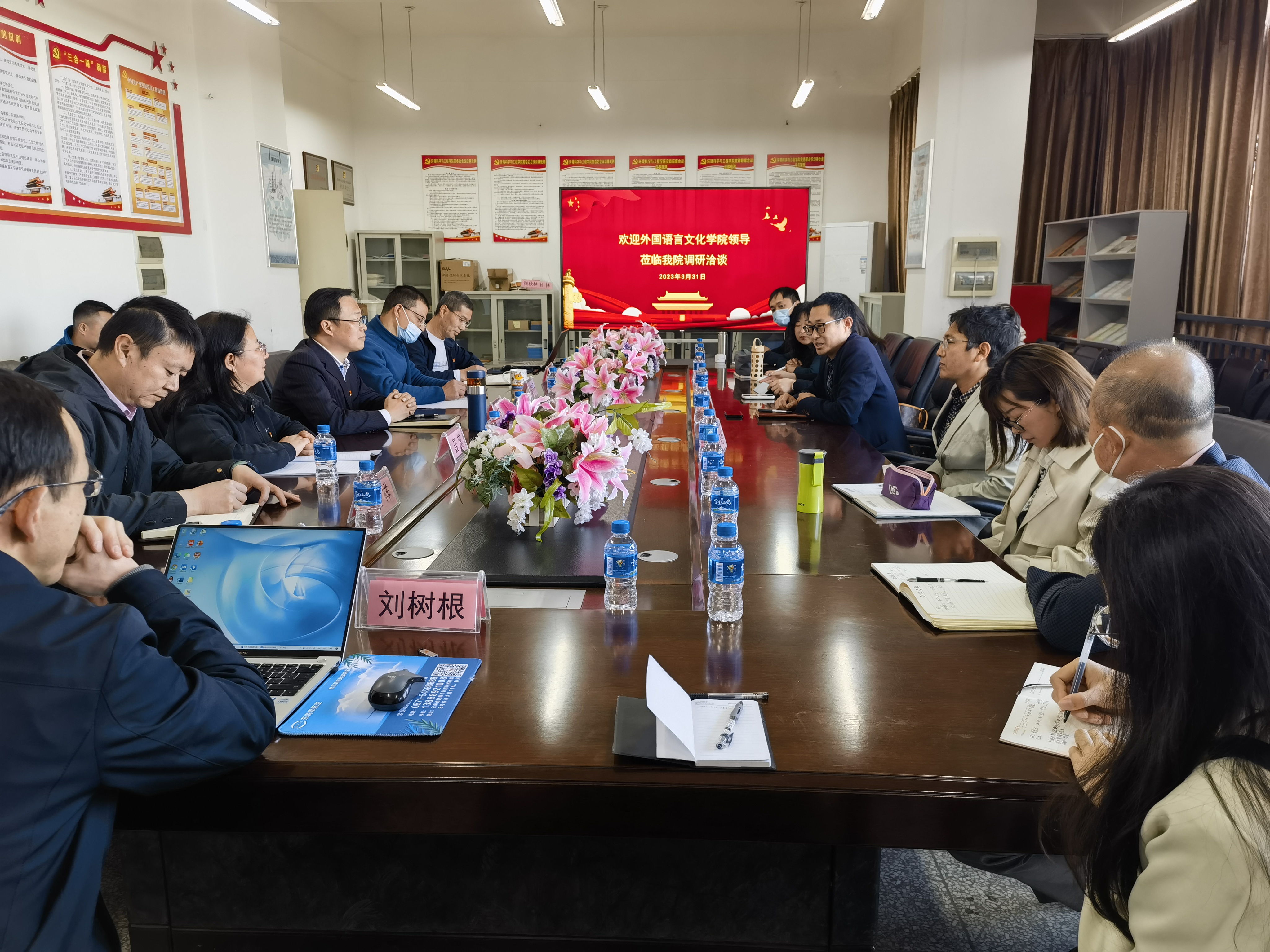 校友工作负责人王杰红就院史材料组织、校友工作等进行了介绍。最后双方就本科生英语综合素质的提升、深造率的提升、大学外语教学改革与试点等工作进行了深入交流。