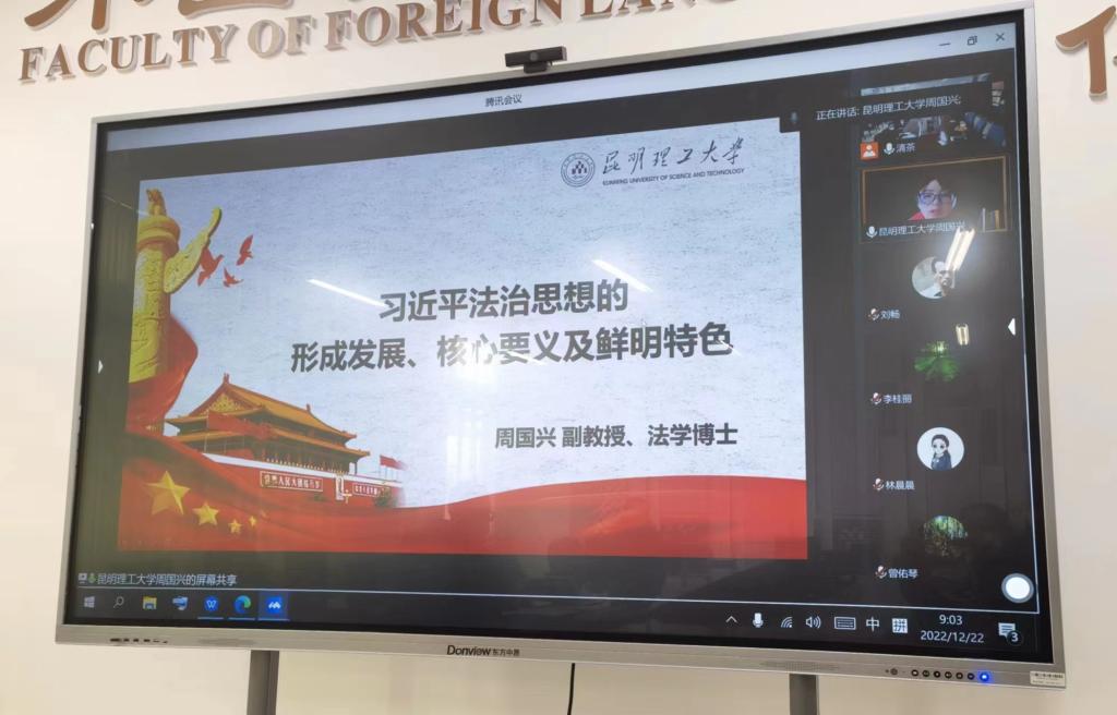 周国兴副教授作专题辅导,周副教授从习近平法治思想形成和发展的时代背景、核心要义、鲜明特色等三个方面系统介绍了习近平法治思想,并结合党的二十大报告中“坚持依法治国,推进法治中国建设”部分详细阐释了二十大精神。