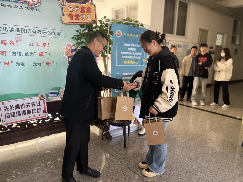 领导和老师与到场学生代表进行交流,亲切问询学生的备考情况,为考研学子送上慰问礼包。本次活动准备共计70余份慰问礼包,发放礼品包含考试文具、祝福书签等,为考研学子送去冬日的温暖祝福。博文楼一楼设考研加油站,大象视频