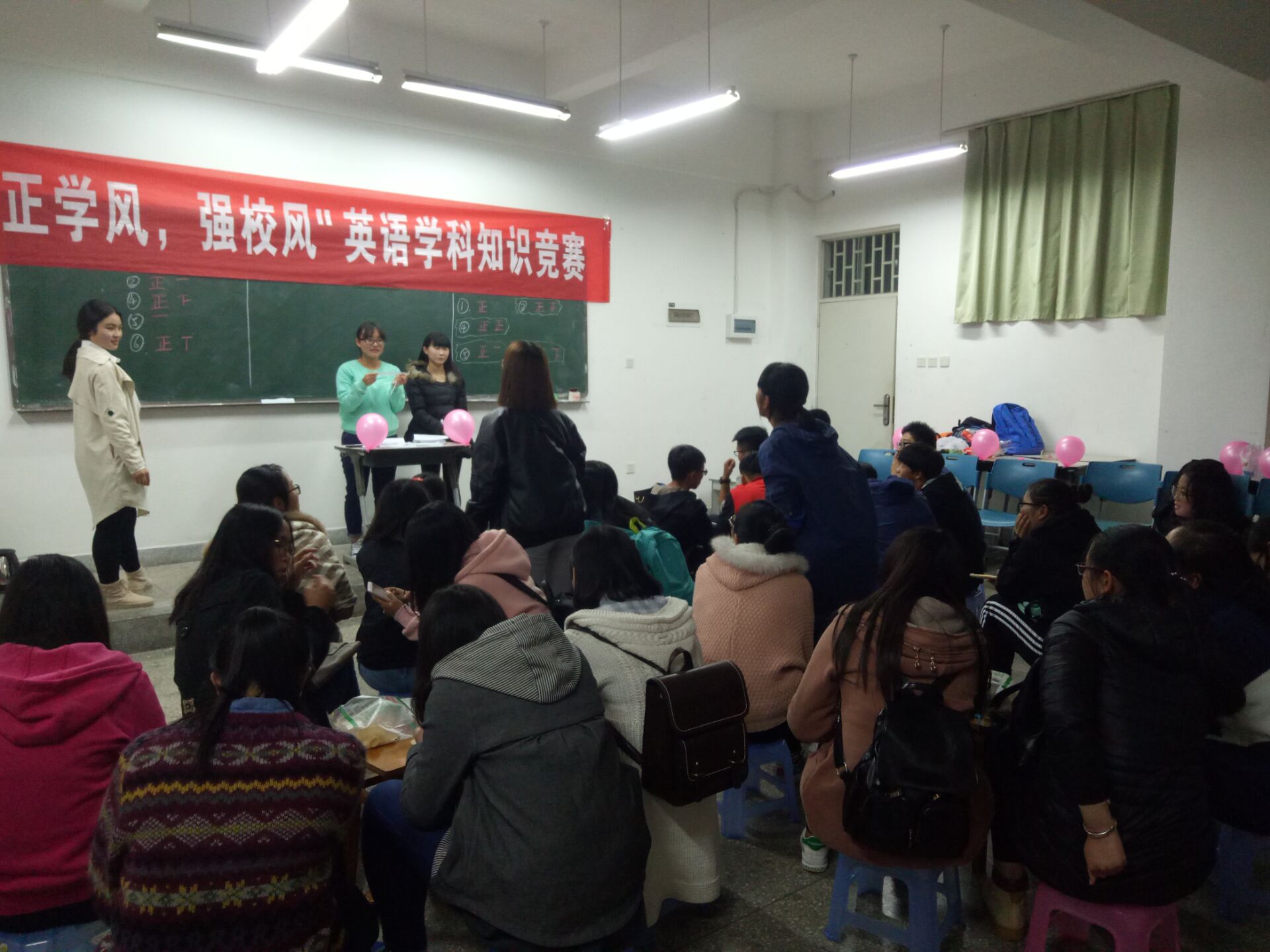 在博文楼212举办以“正学风,强校风”为主题的英语学科知识竞赛。本次知识竞赛由外文院16级同学黄蕾和潘霞主持,外文院16级同学积极参加比赛。