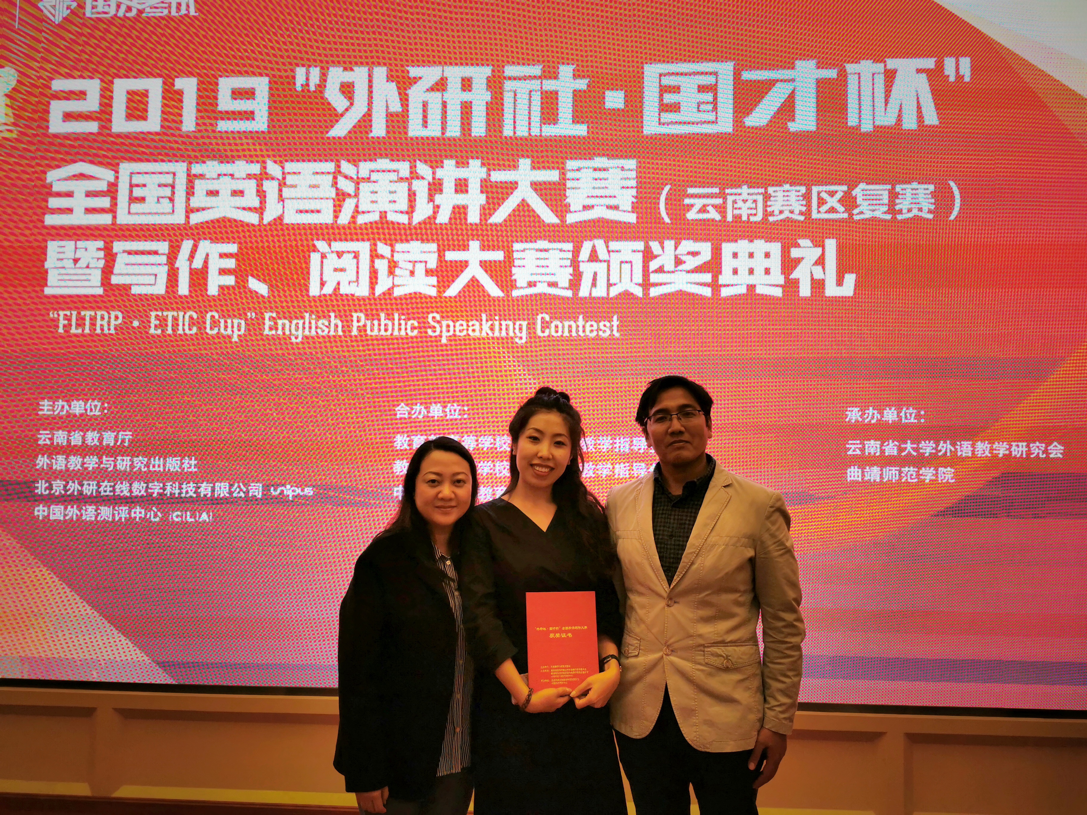 MTI笔译专业一年级学生朱玥同学获得云南省一等奖,管经院一年级研究生唐雪榕同学获得云南省二等奖。随后,2019“外研社·国才杯”全国英语大赛云南赛区复赛写作、阅读、演讲三项赛事的的颁奖典礼隆重举行,曲靖师范大象视频