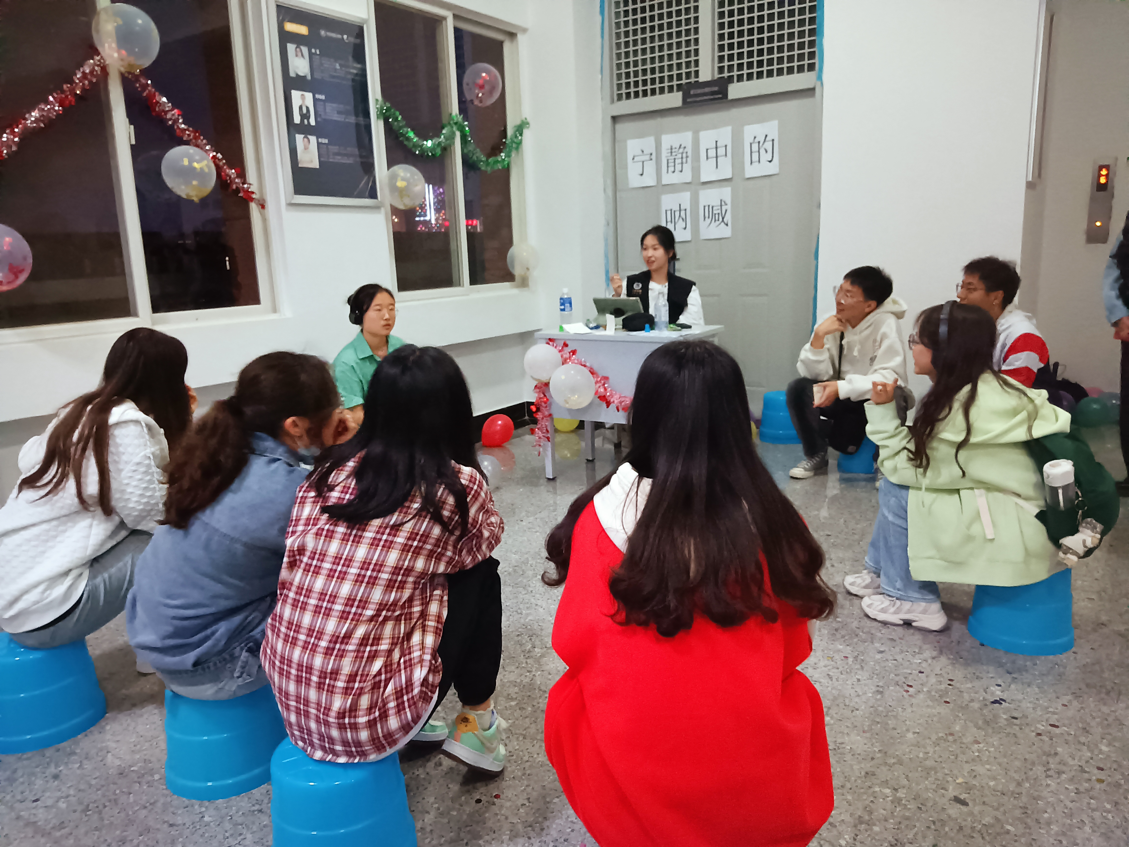 18点,活动正式开始。首先,乐队进行开场表演为本次活动营造热烈的活动氛围,两位主持人宣布游戏环节的具体楼层。游戏包括:抢凳子、棋逢对手、同舟共济、联络口译、心口不一和听歌识曲等八项环节。接下来,参与人员前往各个楼层完成游戏,每完成一项游戏即可获得专属印章,最终获得超过8个印章即可参与抽奖。最后,两位主持人宣布此次活动圆满结束,工作人员合影留恋。