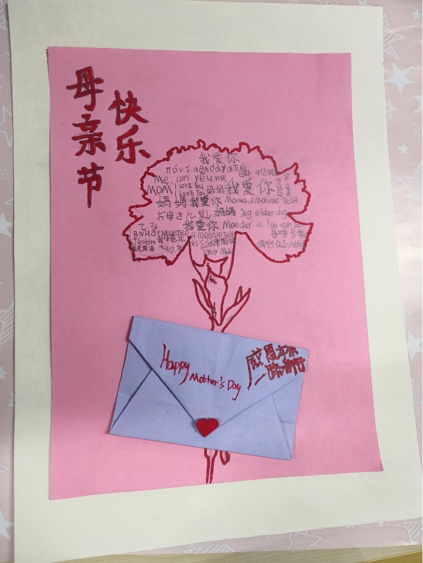 随后,所有参加活动的学生以“母爱无疆、感恩在心”为主题,制作感恩贺卡。期间,同学们利用自己在绘画、书法、手工等方面的长处,制作了一份份精致的贺卡。制作完成后,学生代表分享了各自作品的制作立意和创新之处。所有学生参加投票活动,评选出一、二、三等奖。